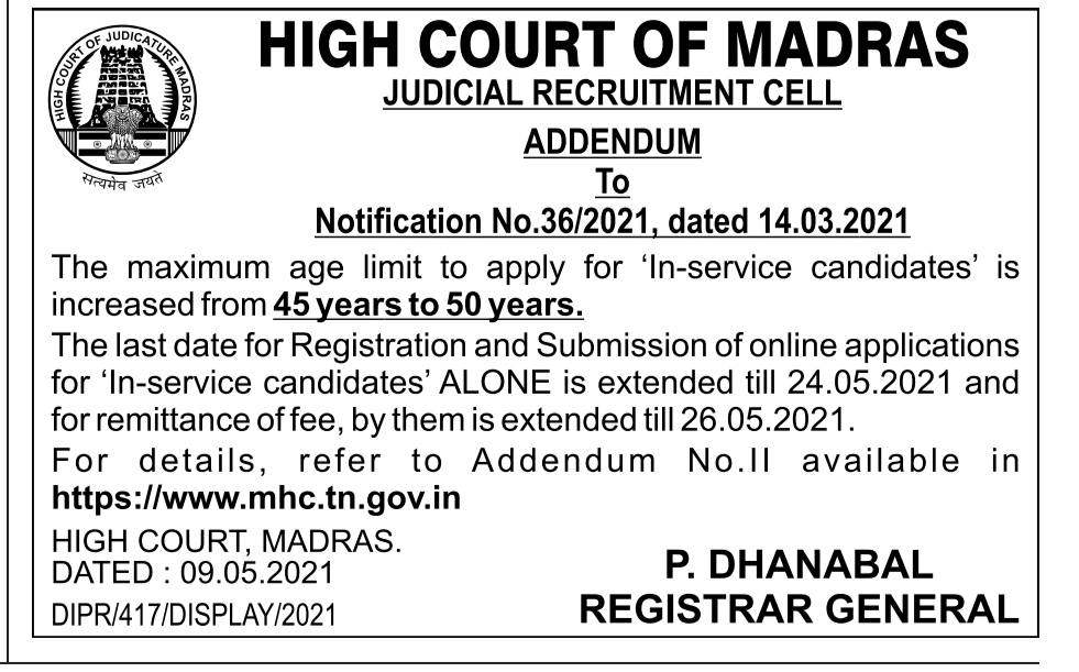 The last date for registration & submission of Online applications for the posts of Chobdar, Office Assistant, Cook, Waterman, Room Boy, Watchman, Book Restorer and Library Attendant in the Madras High Court Service is extended from 21.04.2021 to 28.04.2021 and Last date for remittance of fee, by Challan through bank is extended from 23.04.2021 to 30.04.2021.