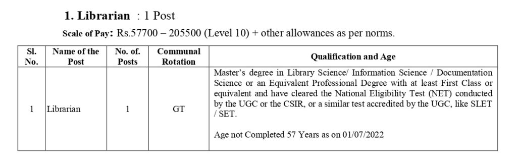 Master’s degree in Library Science/ Information Science / Documentation Science or an Equivalent Professional Degree with at least First Class or equivalent and have cleared the National Eligibility Test (NET) conducted by the UGC or the CSIR, or a Similar Test accredited by the UGC, like SLET / SET.