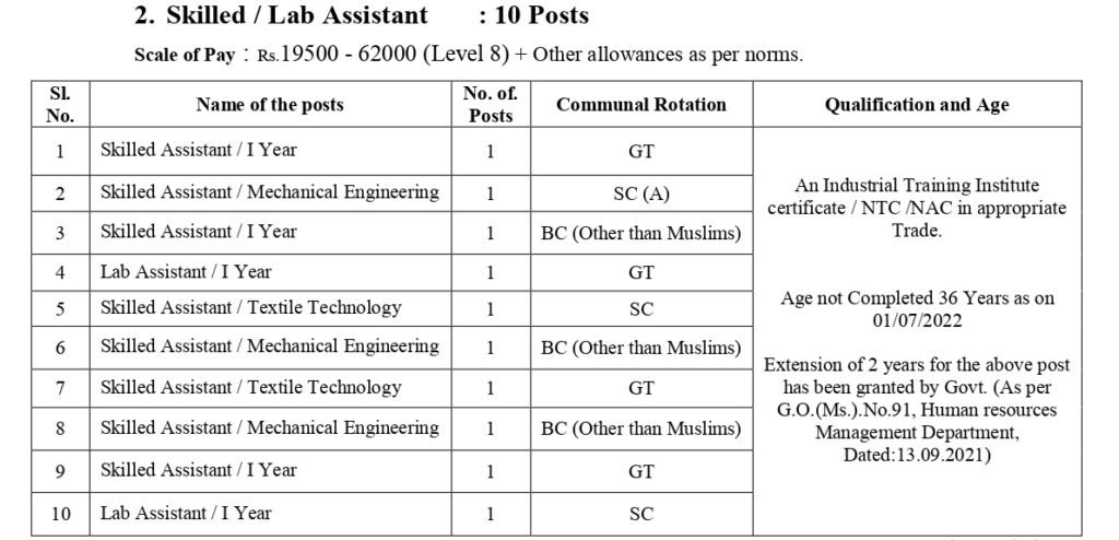 Skilled Assistant/Lab Assistant – Age not Completed 36 Years as on 1/7/2022