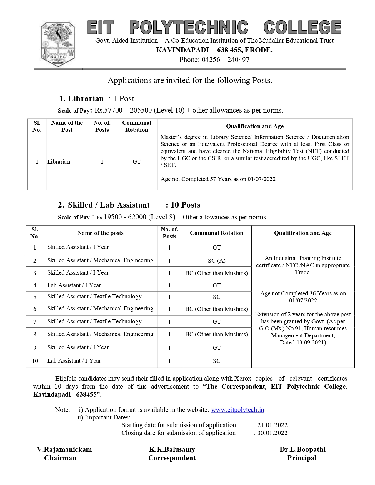 The Correspondent, EIT Polytechnic College, Kavindapadi – 638 455.