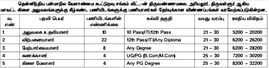 Applications in the prescribed format are invited from the applicants for the post of Office Assistants, Salesmans, Supervisors, Accountant and Branch Managers for the vacancy year of 2022 in Thiruvannamalai, Ariyalur and Thiruvallur Branches.