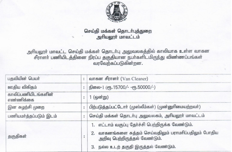 அரியலூர் மாவட்ட செய்தி மக்கள் தொடர்புத்துறையில் காலியாக உள்ள வாகனச் சீராளர் பதவிக்கு தகுதியான நபர்களிடமிருந்து விண்ணப்பங்கள் வரவேற்கப்படுகின்றன