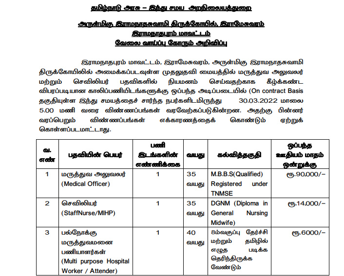 Arulmigu Ramanathaswamy Temple Rameswaram Recruitment 2022 Click here