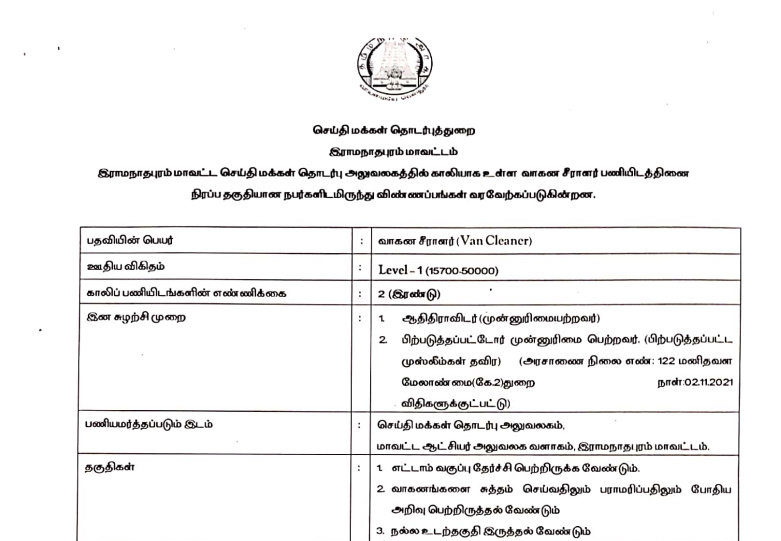 இராமநாதபுரம் மாவட்ட செய்தி மக்கள் தொடர் அலுவலகத்தில் காலியாக உள்ள வாகன சீராளர் பதவிக்கு வேலைவாய்ப்பு அறிவிப்பு