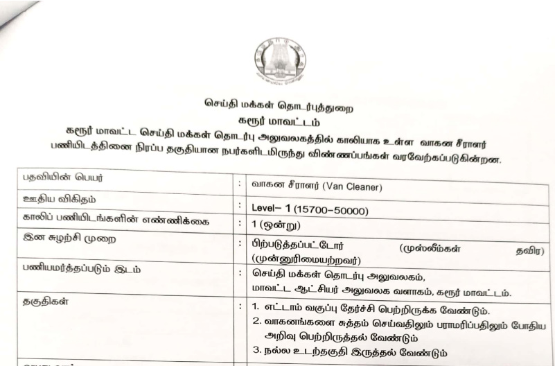கரூர் மாவட்ட செய்தி மக்கள் தொடர் அலுவலகத்தில் காலியாக உள்ள வாகன சீராளர் பதவிக்கு வேலைவாய்ப்பு அறிவிப்பு