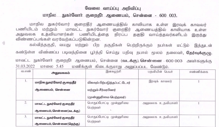 தமிழ்நாடு மாநில நுகர்வோர் குறைதீர் ஆணையத்தில் பணியிடங்கள்:-