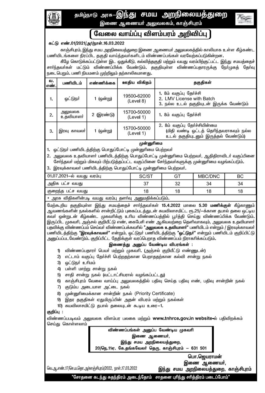 காஞ்சிபுரம், இந்து சமய அறநிலையத் துறை , இணை ஆணையர் அலுவலகத்தில் காலியாக உள்ள அலுவலக உதவியாளர் வேலை, ஓட்டுநர் மற்றும் இரவுக்காவலர் பதவிகள் அறிவிப்பு