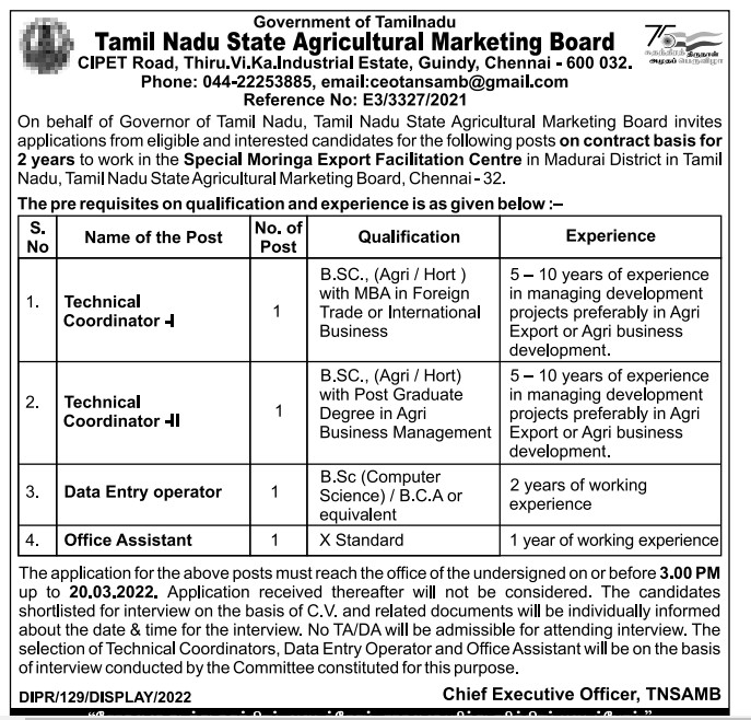 தமிழ்நாடு மாநில வேளாண் விற்பனை வாரியம் வேலைவாய்ப்பு அறிவிப்பு 2022