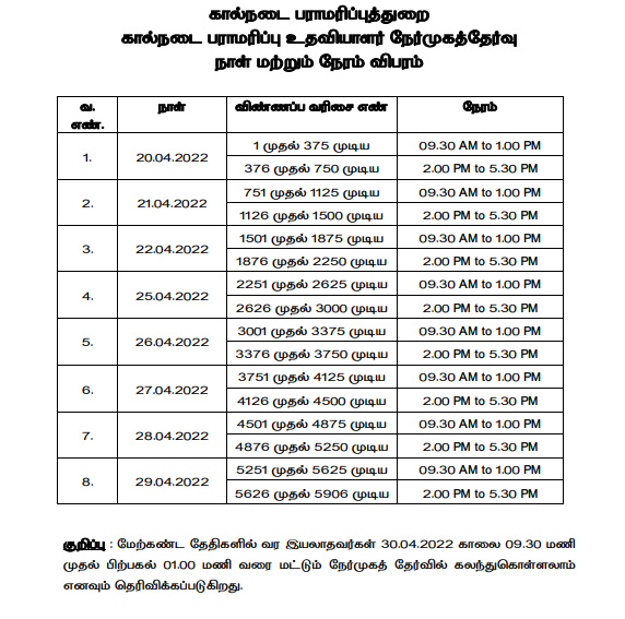 ஏற்கனவே விண்ணப்பித்தவர்களுக்கான நேர்காணல் தேர்வு 20.4.2022 முதல் 22.4.2022 வரை( 23.4.2022,24.4.2022 நீங்கலாக) 25.4.2022 முதல் 30.4.2022 வரை