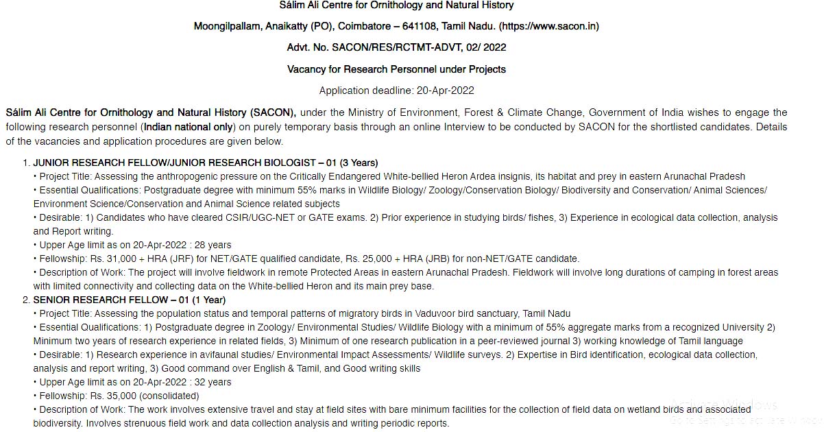 Desirable: 1) Candidates who have cleared CSIR/UGC-NET or GATE exams. 2) Prior experience in studying birds/