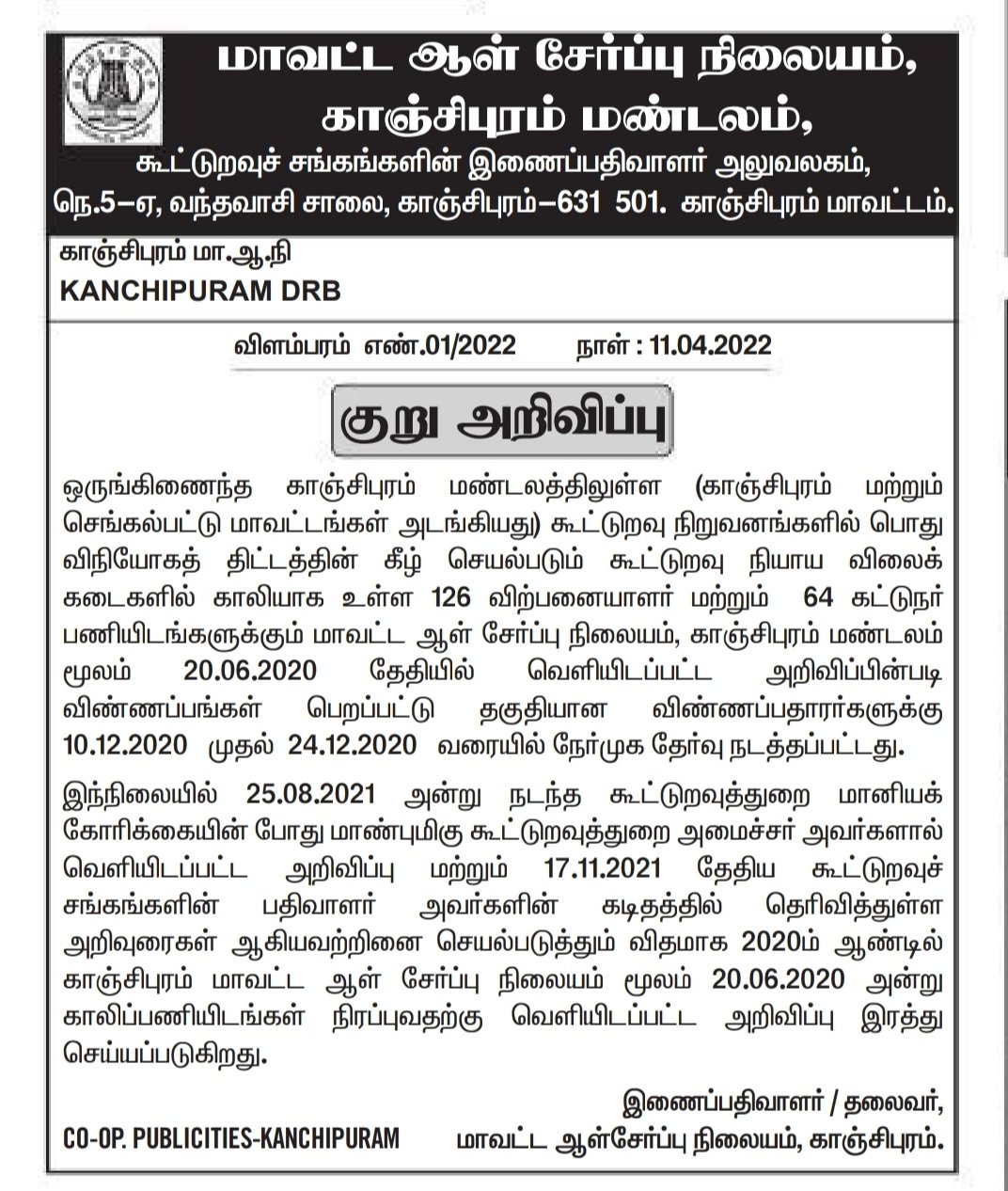 இந்த நிலையில் 25.8.2021 அன்று நடந்த கூட்டுறவுத் துறை மானியக் கோரிக்கையின் போது மாண்புமிகு கூட்டுறவுத்துறை அமைச்சர் அவர்களால் வெளியிடப்பட்ட அறிவிப்பு மற்றும் 17.11 2021 தேதிய கூட்டுறவு சங்கங்களின் பதிவாளர் அவர்களின் கடிதத்தில் தெரிவித்துள்ள அறிவுரைகள் ஆகியவற்றினை செயல்படுத்தும் விதமாக 2020ஆம் ஆண்டில் காஞ்சிபுரம் மாவட்ட ஆள்சேர்ப்பு நிலையம் மூலம் 20.6.2020 அன்று காலிபணியிடங்கள் நிரப்புவதற்கு வெளியிடப்பட்ட அறிவிப்பு ரத்து செய்யப்படுகிறது.