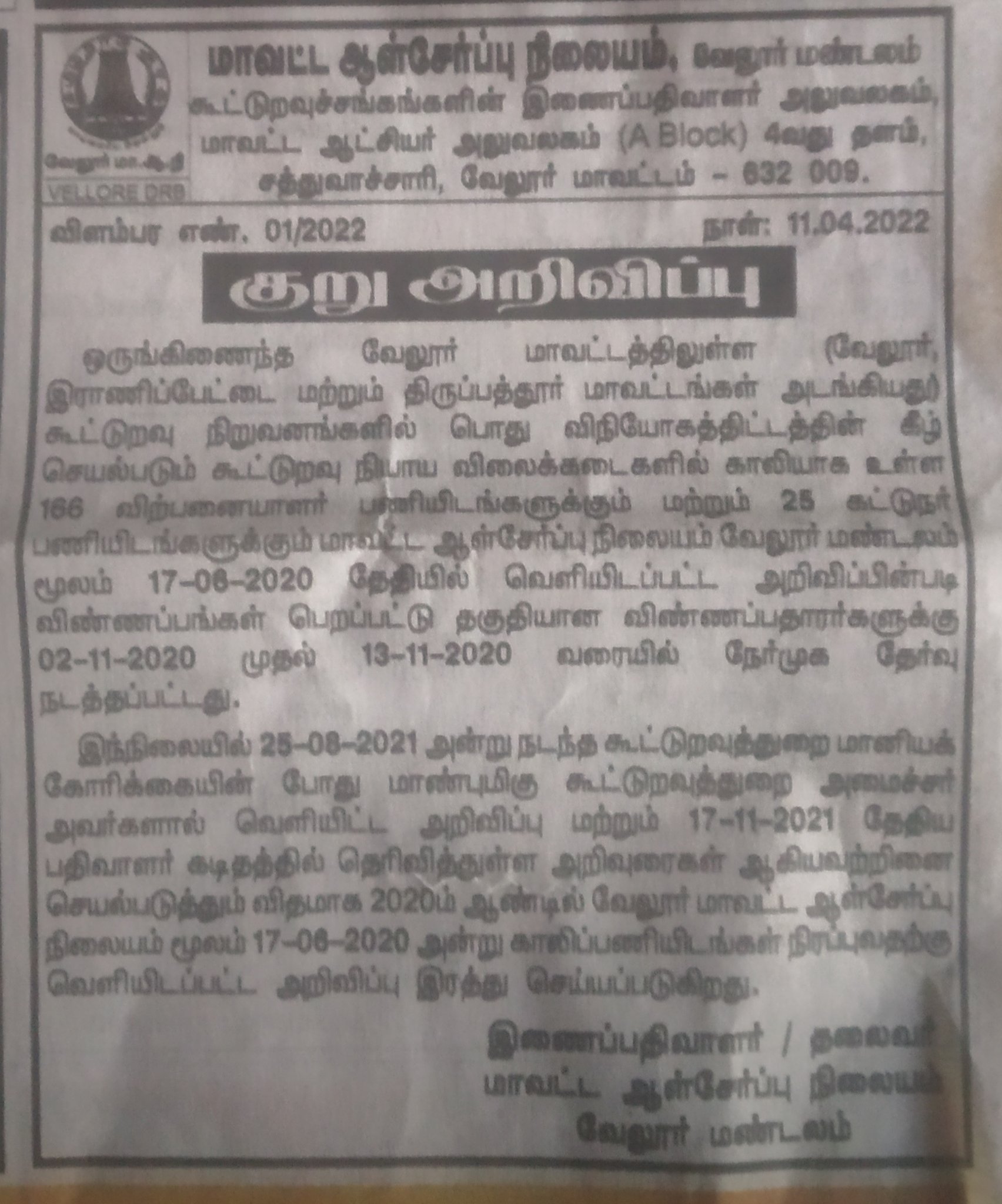 இந்த நிலையில் 25.8.2021 அன்று நடந்த கூட்டுறவுத் துறை மானியக் கோரிக்கையின் போது மாண்புமிகு கூட்டுறவுத்துறை அமைச்சர் அவர்களால் வெளியிடப்பட்ட அறிவிப்பு மற்றும் 17.11 2021 தேதிய கூட்டுறவு சங்கங்களின் பதிவாளர் அவர்களின் கடிதத்தில் தெரிவித்துள்ள அறிவுரைகள் ஆகியவற்றினை செயல்படுத்தும் விதமாக 2020ஆம் ஆண்டில் வேலூர் மாவட்ட ஆள்சேர்ப்பு நிலையம் மூலம் 17.6.2020 அன்று காலிபணியிடங்கள் நிரப்புவதற்கு வெளியிடப்பட்ட அறிவிப்பு ரத்து செய்யப்படுகிறது.