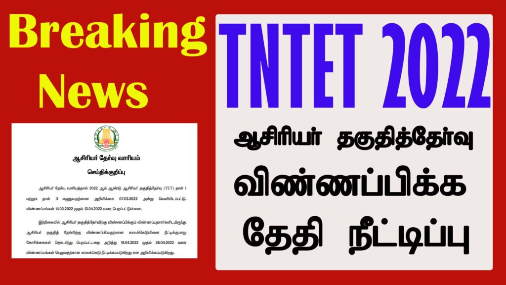 ஆசிரியர் தேர்வு வாரியத்தால் 2022ஆம் ஆண்டு ஆசிரியர் தகுதித் தேர்வு தாள்-1 மற்றும் தாள்-2 எழுதுவதற்கான அறிவிக்கை 7.3.2022 அன்று வெளியிடப்பட்டு விண்ணப்பங்கள் 14.3.2022 முதல் 13.4.2022 வரை பெறப்பட்டுள்ளன இந்த நிலையில் ஆசிரியர் தகுதித் தேர்வுக்கு விண்ணப்பிக்கும் விண்ணப்பதாரர்களிடமிருந்து ஆசிரியர் தகுதி தேர்வுக்கு விண்ணப்பிப்பதற்கான காலக்கெடுவினை நீட்டிக்குமாறு கோரிக்கைகள் தொடர்ந்து பெறப்பட்டதை அடுத்து இன்று (18.4.2022) முதல் 26.4.2022 வரை விண்ணப்பங்கள் பெறுவதற்கான காலக்கெடு நீட்டிக்கப்படுகிறது என தெரிவிக்கப்பட்டுள்ளது.
