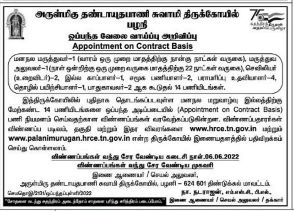 அருள்மிகு தண்டாயுதபாணி சுவாமி திருக்கோயில் பழனி ஒப்பந்த வேலைவாய்ப்பு அறிவிப்பு