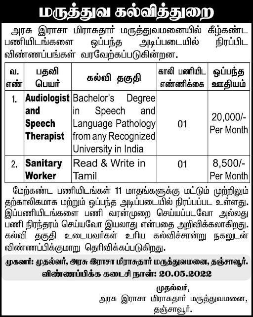 அரசு இராசா மிராசுதார் மருத்துவமனையில் கீழ்கண்ட பணியிடங்களை ஒப்பந்த அடிப்படையில் நிரப்பிட விண்ணப்பங்கள் வரவேற்கப்படுகின்றன.