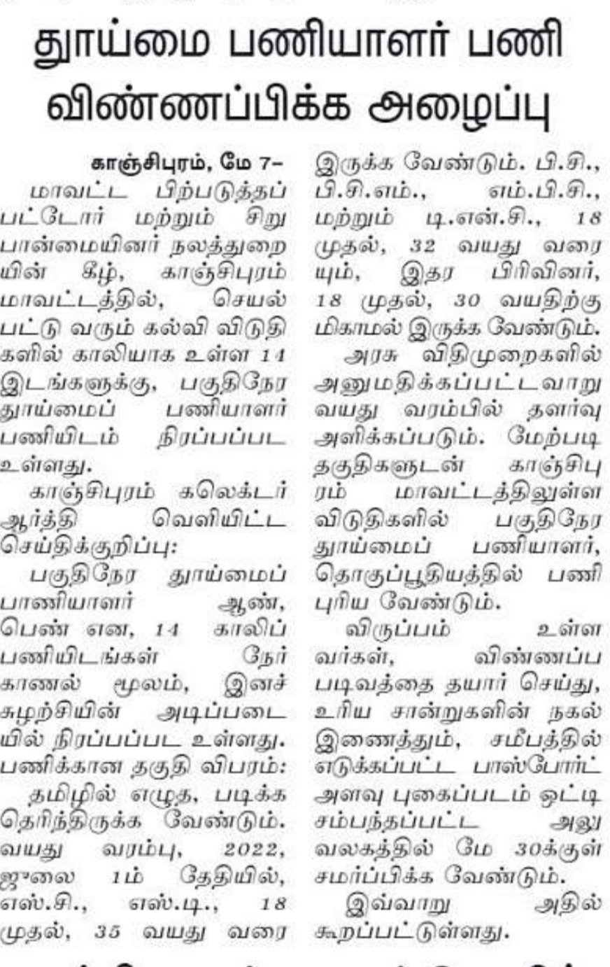 மேற்படி தகுதிகளுடன் காஞ்சிபுரம் மாவட்டத்தில் உள்ள கல்வி விடுதிகளில் பகுதிநேர தூய்மைப் பணியாளர் பணி புரிய விருப்பம் உள்ளவர்கள் விண்ணப்பத்தை பூர்த்தி செய்து உரிய சான்றுகளின் நகல்கள் இணைத்து சமீபத்தில் எடுக்கப்பட்ட புகைப்படம் ஒட்டி அதனை சம்பந்தப்பட்ட அலுவலகத்தில் 30.5.2022 -க்குள் சமர்பிக்கும்படி கேட்டுக் கொள்ளப்படுகிறது.