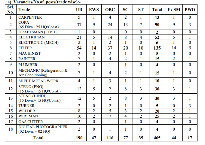Online application through the website: https://www.apprenticeshipindia.gov.in from 23.05.2022 to 22.06.2022 (till 23:59 hrs) are invited from the eligible candidates for engagement as Trade Apprentices under Apprentices Act 1961 in Bilaspur Division of South East Central Railway against the following designated trades:-