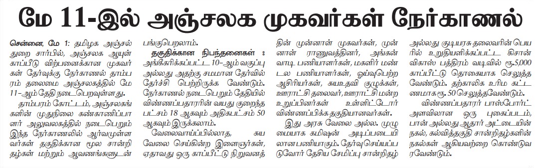 தமிழக அஞ்சல் துறை சார்பில் அஞ்சலக ஆயுள் காப்பீடு விற்பனைக்கான முகவர்கள் தேர்வுக்கு நேர்காணல் தாம்பரம் தலைமை அஞ்சலகத்தில் மே 11ஆம் தேதி நடைபெற உள்ளது.