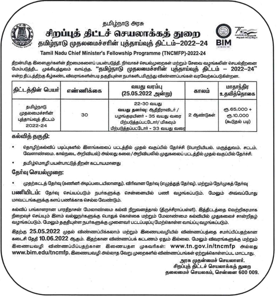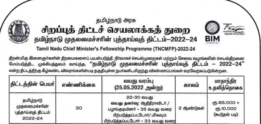 prestigious Tamil Nadu Chief Minister’s Fellowship Programme (TNCMFP) 2022-24.