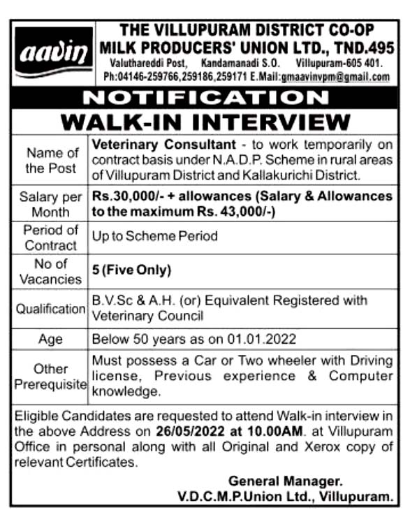 விழுப்புரம் மற்றும் கள்ளக்குறிச்சி மாவட்டத்தில் காலியாக கால்நடை மருத்துவ ஆலோசகர் பணிக்கு நேர்காணல் அறிவிப்பு
