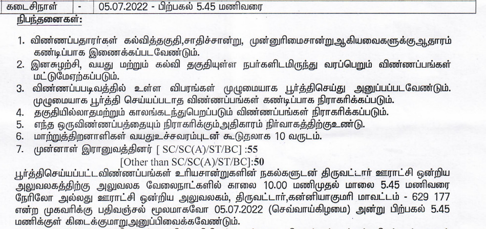 கன்னியாகுமரி மாவட்டம் , திருவட்டார் ஊராட்சி ஒன்றிய ஊரக வளர்ச்சி மற்றும் ஊராட்சி அலகில் காலியாக உள்ள அலுவலக உதவியாளர் பதவிக்கு வேலைவாய்ப்பு அறிவிப்பு
