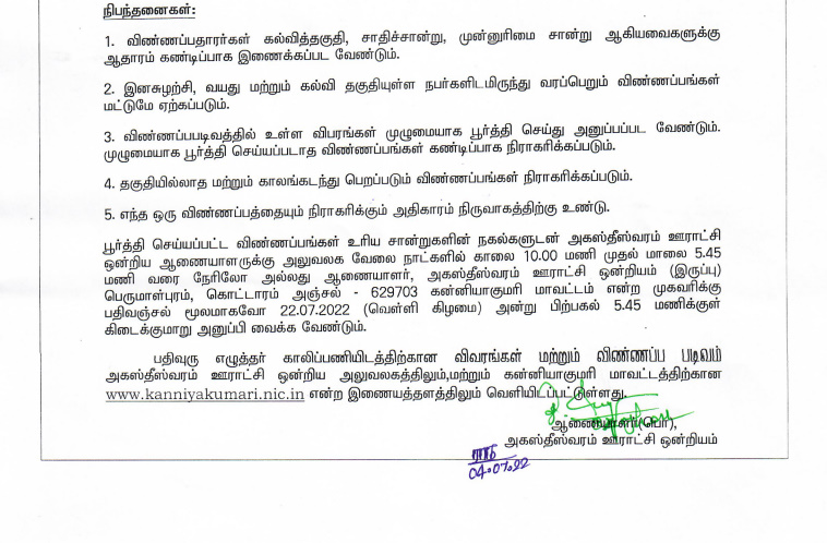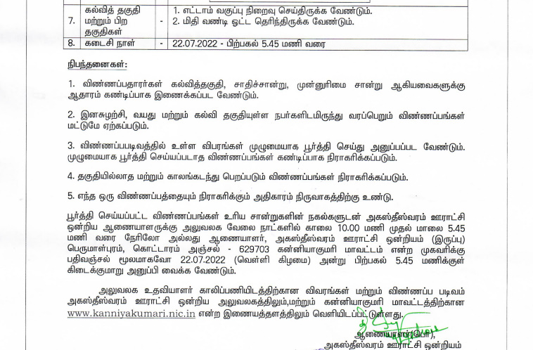 கன்னியாகுமரி மாவட்டம் , அகஸ்தீஸ்வரம் ஊராட்சி ஒன்றிய அலுவலகத்தில் காலியாக உள்ள பதிவுறு எழுத்தர், அலுவலக உதவியாளர் பதவிகளுக்கு வேலைவாய்ப்பு அறிவிப்பு