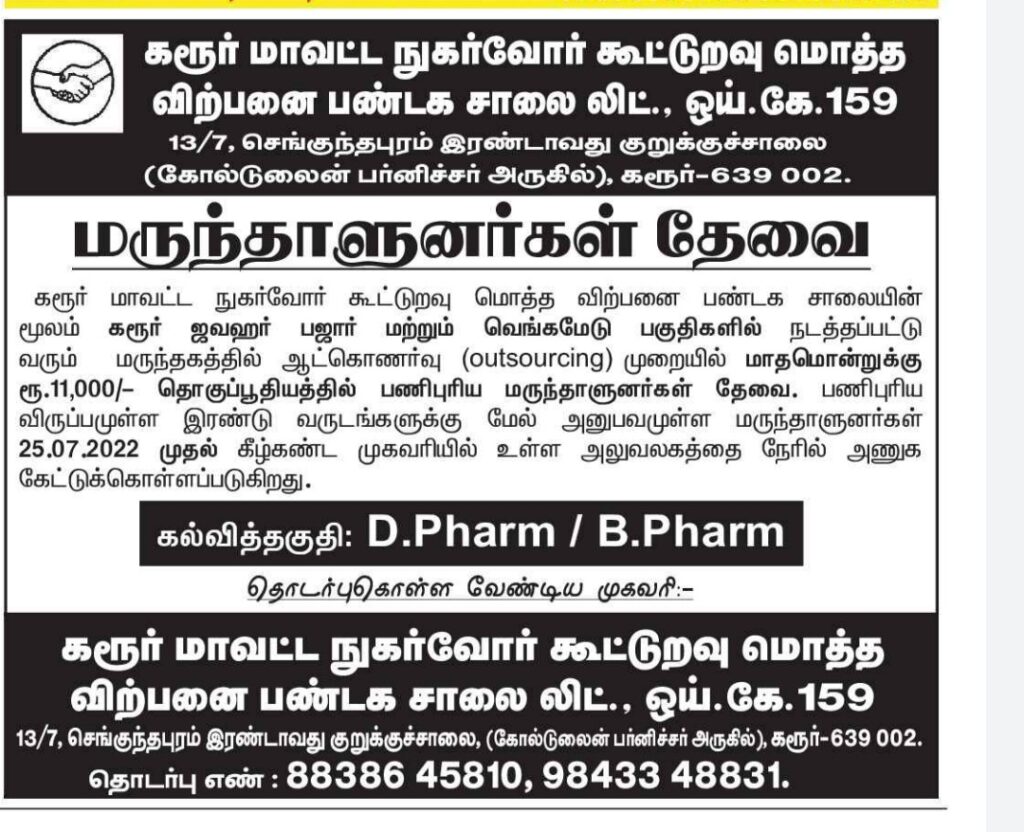 Cooperative Department Jobs Leave a Comment / Jobs / By admin கரூர் மாவட்ட நுகர்வோர் கூட்டுறவு மொத்த விற்பனை பண்டக சாலை லிட் வேலைவாய்ப்பு அறிவிப்பு Pharmacist D.pharm/B.pharm and 2 Years experience Salary Rs.11000/- Notification Click here Post Views: 619