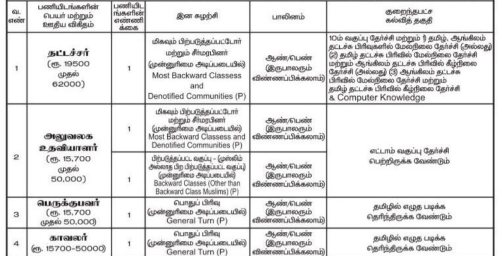 பத்தாம் வகுப்பு தேர்ச்சி பெற்றிருக்க வேண்டும் மற்றும் தமிழ், ஆங்கிலம் தட்டச்சு பிரிவுகளில் மேல்நிலை தேர்ச்சி பெற்றிருக்க வேண்டும் அல்லது தமிழ் தட்டச்சு பிரிவில் மேல்நிலை தேர்ச்சி மற்றும் ஆங்கிலம் தட்டச்சு பிரிவில் கீழ்நிலை தேர்ச்சி பெற்றிருக்க வேண்டும் அல்லது ஆங்கிலம் தட்டச்சு பிரிவில் மேல்நிலை தேர்ச்சி மற்றும் தமிழ் தட்டச்சு பிரிவில் கீழ்நிலை தேர்ச்சி பெற்றிருக்க வேண்டும் மற்றும் கணினி அலுவலக அனுபவம் பெற்றிருக்க வேண்டும்.