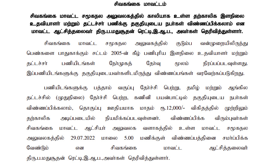 சிவகங்கை மாவட்ட சமூக நல அலுவலகத்தில் காலியாக உள்ள இளநிலை உதவியாளர் மற்றும் தட்டச்சர் பணிக்கு தகுதியுடையவர்கள் விண்ணப்பிக்கலாம்.