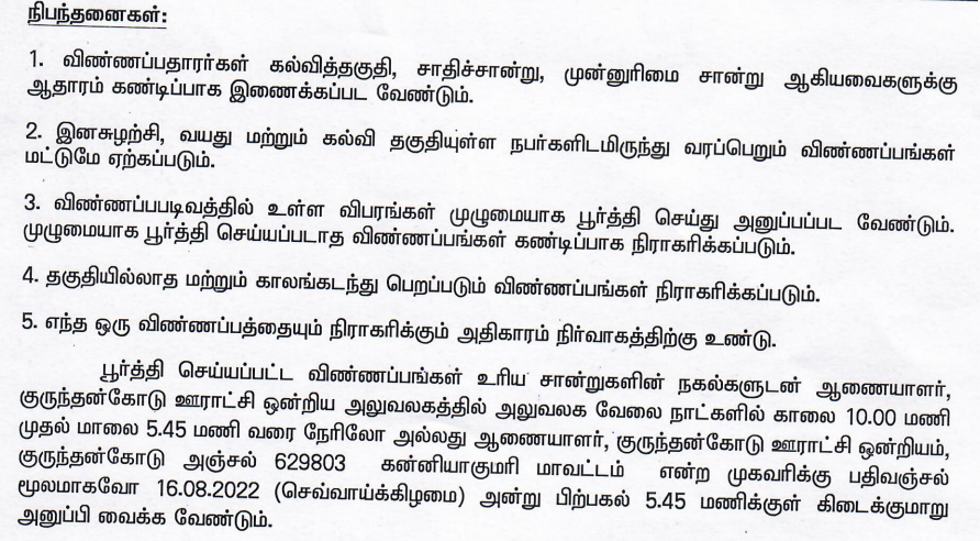 கன்னியாகுமரி மாவட்டம் , குருந்தன்கோடு ஊராட்சி ஒன்றிய அலுவலகத்தில் காலியாக உள்ள அலுவலக உதவியாளர், இரவு காவலர் மற்றும் பதிவுறு எழுத்தர் பதவிகளுக்கு வேலைவாய்ப்பு அறிவிப்பு