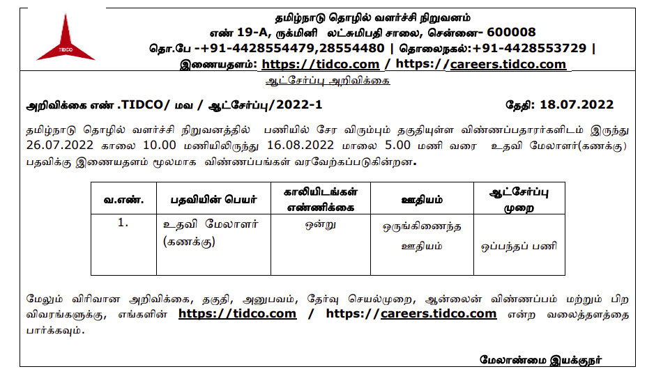Applications are invited for the post of Assistant Manager (Accounts) only through online mode from 26.07.2022 at 10 am to 16.08.2022 upto 5 pm from the eligible candidates who wish to join the services of Tamilnadu Industrial Development Corporation Limited,(TIDCO) as detailed below:-