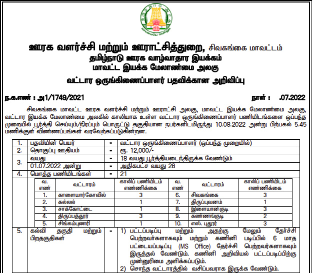 சிவகங்கை மாவட்ட ஊரக வளர்ச்சி மற்றும் ஊராட்சி துறை , மாவட்ட இயக்க மேலாண்மை அலகு,வட்டார இயக்க மேலாண்மை அலகில் காலியாக உள்ள வட்டார ஒருங்கிணைப்பாளர் பணியிடத்தை நிரப்ப அறிவிப்பு