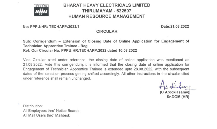 b) After completing registration in www.mhrdnats.gov.in portal, the candidates may apply online in BHEL Trichy Portal in the link – https://trichy.bhel.com Apprenticeship Application Portal (THIRUMAYAM).