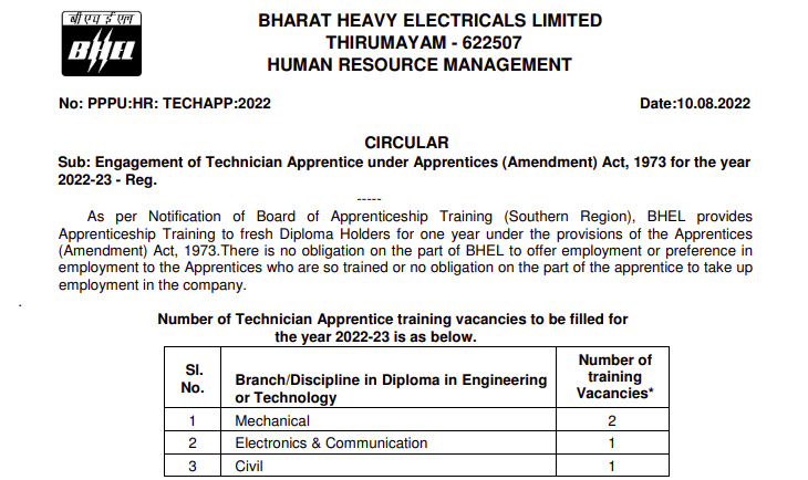 Apprenticeship Training to fresh Diploma Holders for one year under the provisions of the Apprentices (Amendment) Act, 1973.There is no obligation on the part of BHEL to offer employment or preference in employment to the Apprentices who are so trained or no obligation on the part of the apprentice to take up employment in the company.