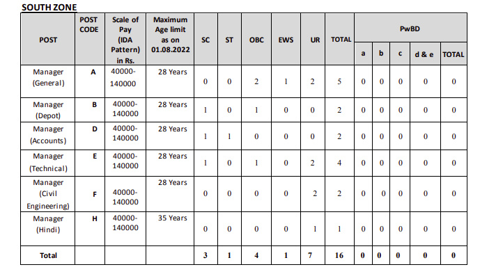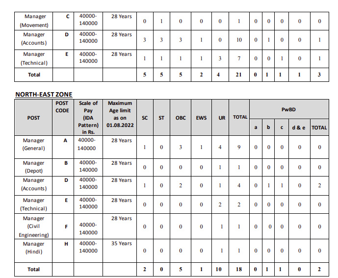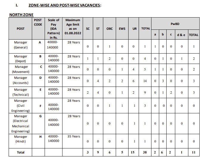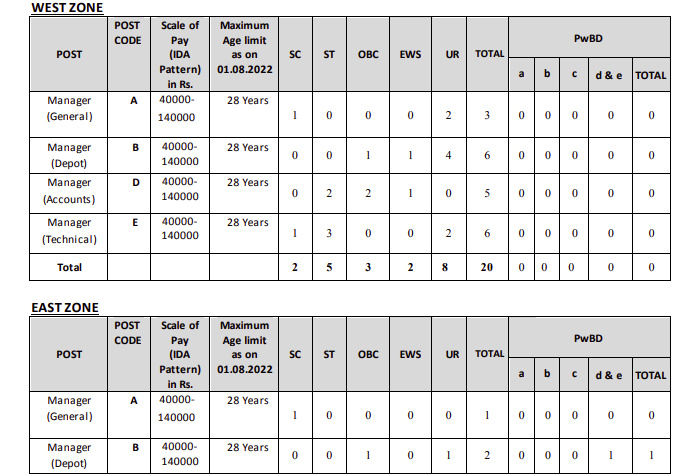 Name of Posts | Manager (General/ Depot/ Movement/ Accounts/ Technical/ Civil Engineering/ Electrical Mechanical Engineering) |