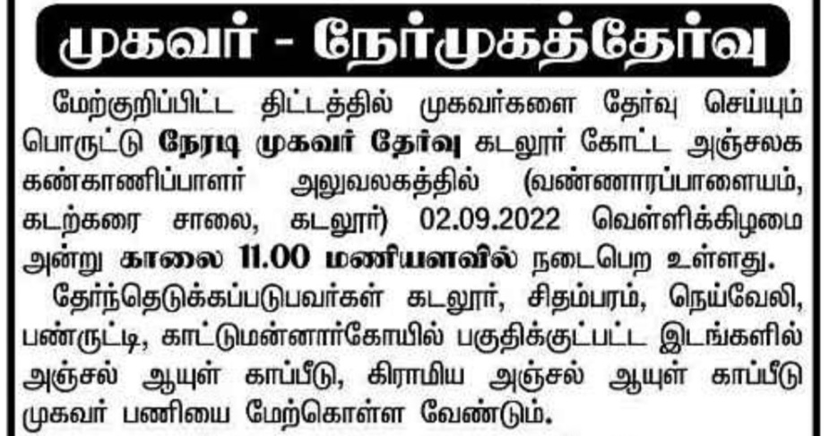 நேரடி முகவர் தேர்வு கடலூர் கோட்ட அஞ்சலக கண்காணிப்பாளர் அலுவலகத்தில் ( வண்ணாரப்பாளையம் கடற்கரை சாலை , கடலூர் ) 2.9.2022 அன்று காலை 11.00 மணியளவில் நடைபெற உள்ளது.