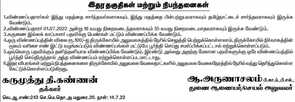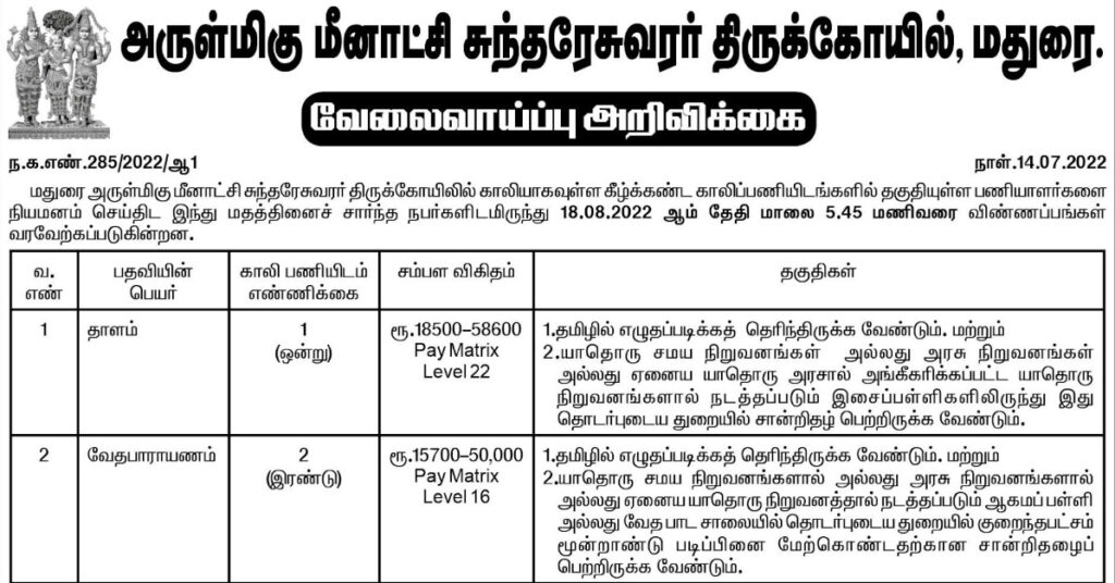மதுரை அருள்மிகு மீனாட்சி சுந்தரேசுவரர் திருக்கோயிலில் காலியாக உள்ள பல்வேறு பதவிகளுக்கு வேலைவாய்ப்பு அறிவிப்பு.