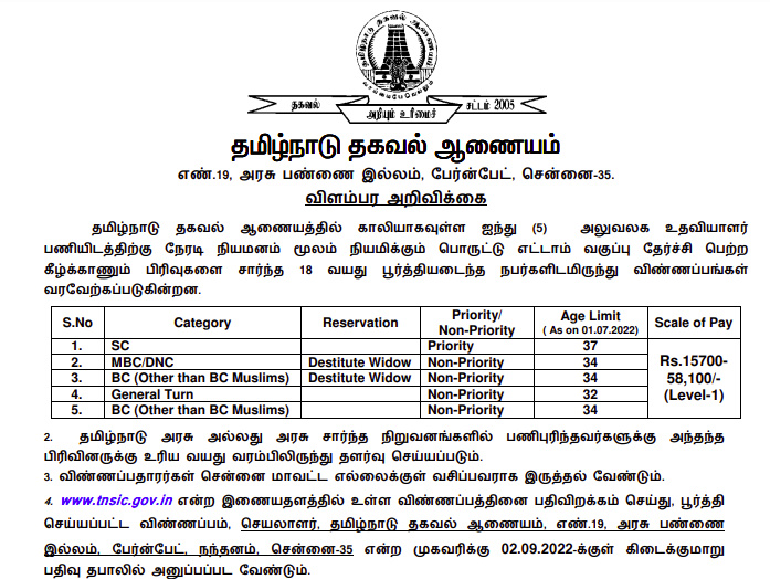 Organization Name: Tamil Nadu Information Commission Job Category: Tamil Nadu Govt Jobs Employment Type: Permanent Jobs Post Name Office Assistant No of Posts 5 Application Fee Nil Last Date 2.9.2022 Apply Mode Offline Official Website : http://www.tnsic.gov.in/