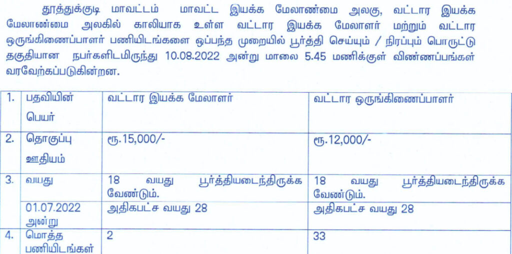 தூத்துக்குடி மாவட்ட ஊரக வளர்ச்சி மற்றும் ஊராட்சி துறை , மாவட்ட இயக்க மேலாண்மை அலகு , வட்டார இயக்க மேலாண்மை அலகில் வேலை