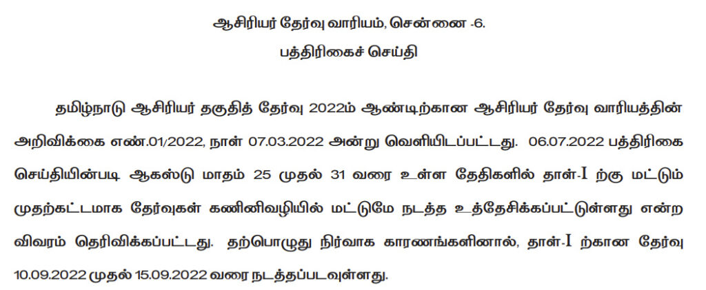 TAMILNADU TEACHER ELIGIBILITY TEST (TNTET) – 2022 Examination Date – TNTET Paper-I