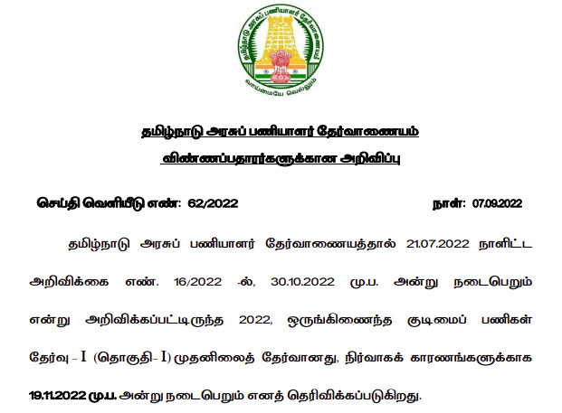30.10.2022 முற்பகல் அன்று நடைபெறுவதாக இருந்த ஒருங்கிணைந்த குடிமைப் பணிகள் தேர்வு – 1 (தொகுதி 1)ல் அடங்கிய பணிகளுக்கான முதல்நிலைத் எழுத்துத் தேர்வு நடைபெறும் தேதி மாற்றம் தொடர்பான செய்தி வெளியீடு