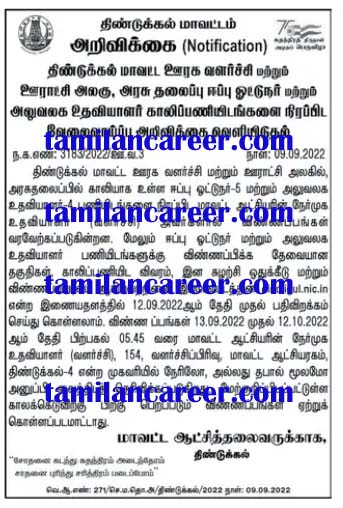 திண்டுக்கல் மாவட்ட , ஊரக வளர்ச்சி மற்றும் ஊராட்சி அலகில் அரசு தலைப்பில் காலியாக உள்ள அலுவலக உதவியாளர் -4 காலியிடங்கள் மற்றும் ஈப்பு ஓட்டுநர் -5 காலிப்பணியிடத்தை நேரடி நியமனம் மூலம் நிரப்பிட தகுதியான விண்ணப்பதாரர்களியிடமிருந்து விண்ணப்பங்கள் வரவேற்கப்படுகின்றன.