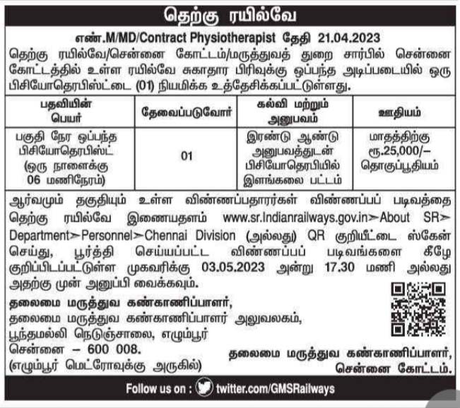 Chennai division has proposed to engage one physiotherapist on monthly remuneration of Rs.25,000/- on contract basis for