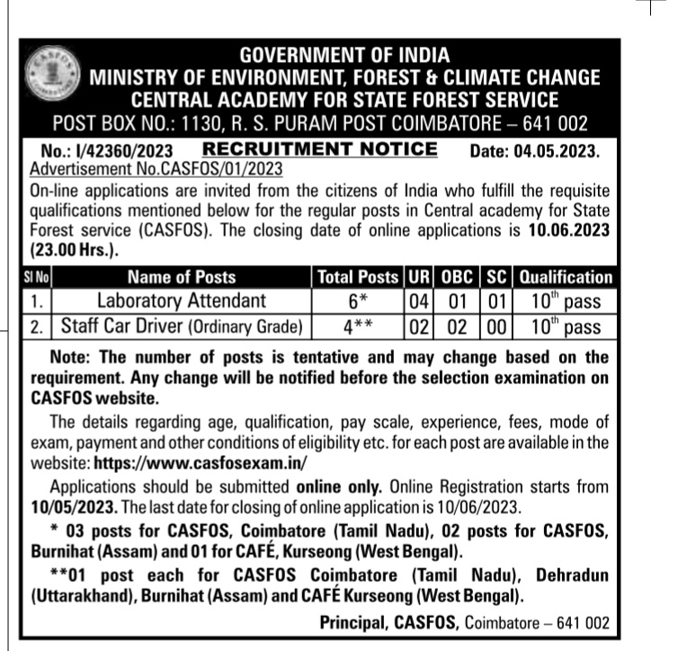 Forest service (CASFOS). The closing date of online applications is 10.06.2023 (23.00 Hrs.)