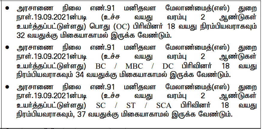 வயதுவரம்பு 1.7.2023 அன்று உள்ளவாறு குறைந்தபட்சம் 18 வயது பூர்த்தி அடைந்திருக்க வேண்டும் அதிகபட்ச வயது வரம்பு பூர்த்தி அடையாமல் இருக்க வேண்டும் (1.7.2023 அன்று உள்ளவாறு)