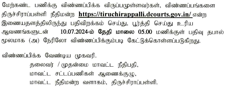 மேற்கண்ட பிரிவினர்கள் Para Legal Volunteers பணிபுரிய விருப்பம் உள்ளவர்கள் விண்ணப்பங்களை https://tiruchirappalli.dcourts.gov.in/notice-category/recruitments/ என்ற திருச்சிராப்பள்ளி மாவட்ட நீதிமன்ற இணையதளத்தில் இருந்து விண்ணப்பங்களை பதிவிறக்கம் செய்து பூர்த்தி செய்து உரிய ஆவணங்களுடன் 10.7.2024 ஆம் தேதி மாலை 5 மணிக்குள் பதிவு தபால் மூலமாகவோ அல்லது நேரிலோ விண்ணப்பிக்கும்படி கேட்டுக் கொள்ளப்படுகிறார்கள்.