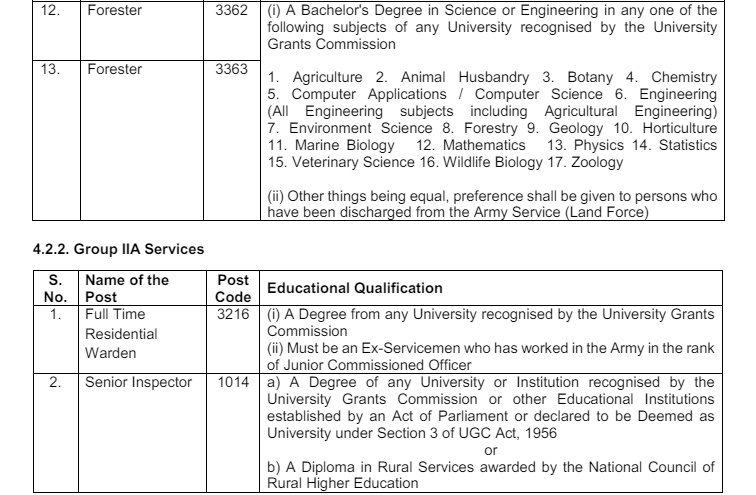 | * For the posts of Forester (Post Codes: 3362 and 3363), a person who has been discharged from any of the Defence services namely, the Army, the Navy, or the Air Force shall be eligible for appointment, if after deducting the period of his services in such service, he has not completed the age of 37 years. | |||||||