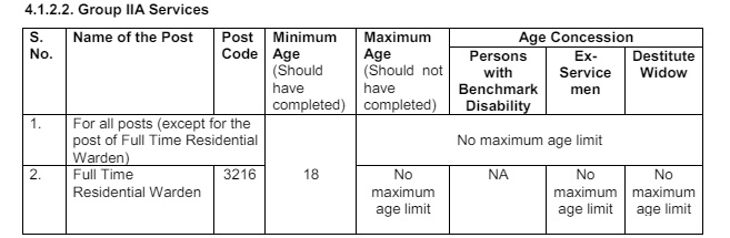 | S. No. | Name of the Post | Post Code | Minimum Age (Should have completed) | Maximum Age (Should not have completed) | Age Concession | ||